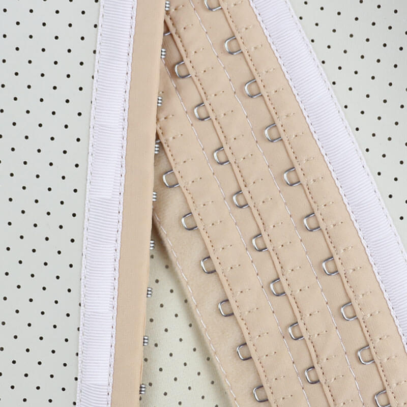 2. 3-row hook-and-eye style, so you can adjust when the waist size gets smaller.